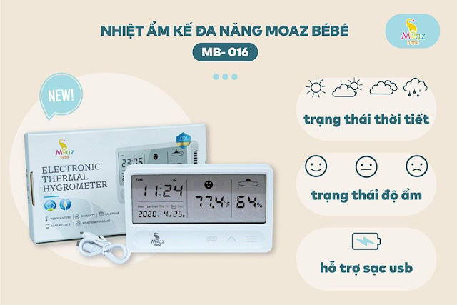 Thiết bị đo độ ẩm và nhiệt độ trong nhà Moaz Bébé MB-016, nói cách khác là một chiếc nhiệt kế ẩm thông minh - sẽ mang đến một sản phẩm tiện ích cho ngôi nhà bạn khi cung cấp đầy đủ và đều đặn những thông tin về nhiệt độ, độ ẩm không khí, thông tin ngày tháng giờ, dự báo thời tiết để từng thành viên trong gia đình vận dụng khi chuẩn bị ra ngoài hay sinh hoạt tại nhà. Với nhiệt ẩm kế của Moaz Bébé, bố mẹ sẽ biết cách xử lý cho không gian ngôi nhà luôn được thoải mái, từ đó bảo vệ và nâng cao sức khỏe cũng như tinh thần cho tất cả các thành viên.